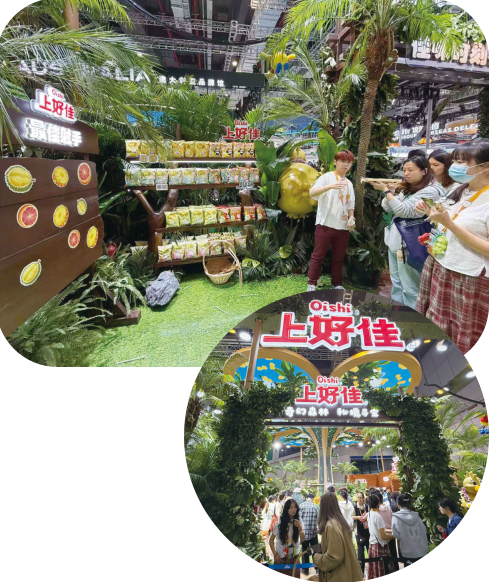 当记者一脚踏入上好佳展台,瞬间穿越到东南亚热带雨林。以“创新突破、推陈出新”为主题的展馆内,C位景观“万象树”搭配声光电特效,光影流转间氛围感拉满,热带植物环绕四周,随手一拍都是朋友圈大片。从1993年扎根青浦到连续8年参展进博会,这个陪伴了几代人成长的品牌,每次都能带来新惊喜。