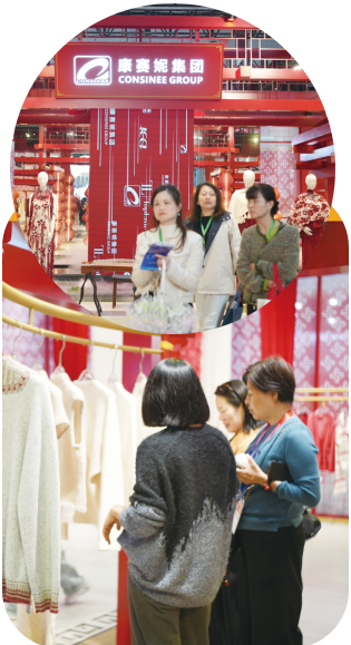 展台内,康赛妮旗下CONSINEE、TOPLINE、ICCI、AITEX WOVEN四大品牌共展出22套高级定制秀款与64件精品成衣。服饰设计中融入盘扣、苏绣、云纹等传统元素,结合品牌精选的顶级羊绒材质,既展现中式风格的文化底蕴,又不失现代时尚感。“此次展品不仅呈现品牌对中式美学的深入理解,也通过沉浸式的空间体验,向世界传递中国纺织工艺的高端质感与文化魅力。”TOPLINE 康宝莱(宁波)织造有限公司总经理徐君秋说,“不少国际客商和参观者对展台的设计与展品表示赞叹,尤其是年轻观众对中式风格的时尚表达表现出浓厚兴趣。”